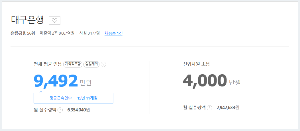 대구은행의 신입사원 초봉은 연 4천만 원이며, 월급으로 환산하면 2백9십만 원 정도 된다.