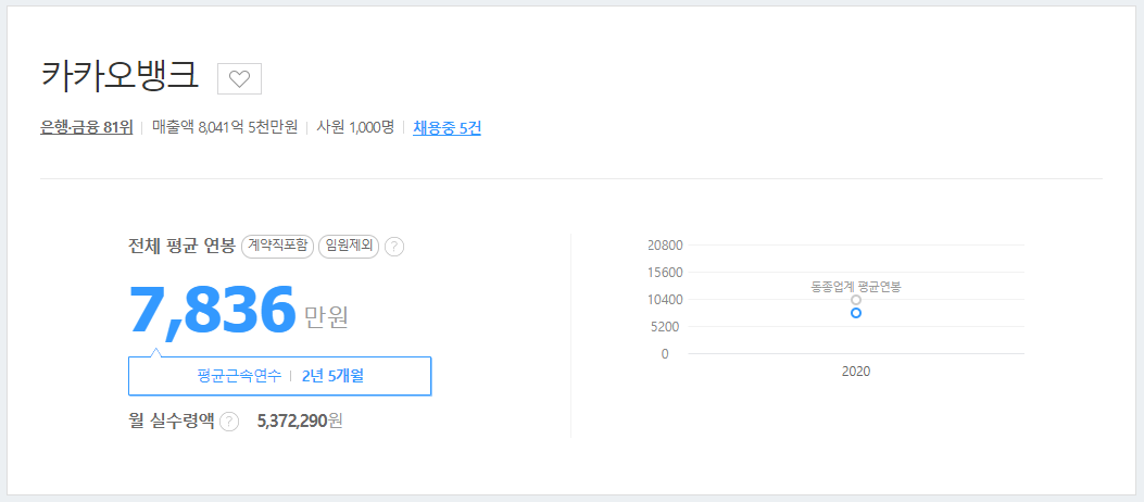 1천여 명이 근무하는 카카오 뱅크 직원의 평균 연봉은 7천8백만 원으로 월 실수령액은 대략 5백3십만 원이다.