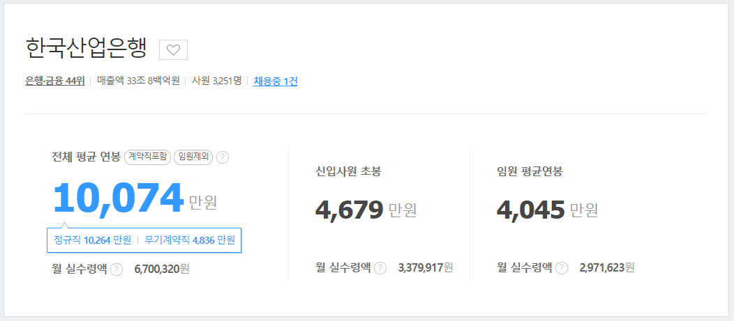 산업은행 신입사원 초봉은 약 4천 6백 8십만 원이며, 식대를 10만 원을 포함한 월 실수령액은 3,379,917원이다.
